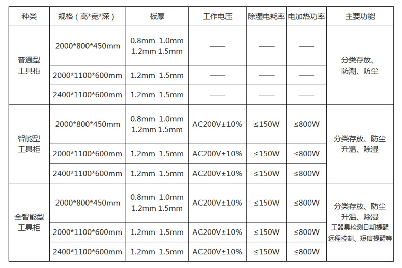 普通智能工具柜里面有一臺除濕機,柜體外面有一個數字顯示器顯示柜內溫濕度,可以通過顯示器上按鍵調節柜內溫濕度大小,結構簡單,操作方便,具體操作詳見智能工具柜說明書