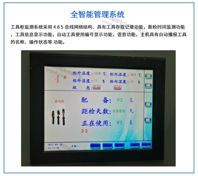 全智能工具柜一般是組合柜,三個工具柜或三個工具柜以上一組,每個工具柜內安有多個探頭,臺柜子上有一個大的LED顯示屏,可以隨時顯示柜內溫度濕度以及柜內每種安全工器具的試驗周期,還顯示使用中絕緣工具的使用數量和編號,絕緣工具拿出使用時柜內開啟識別系統,自動監視絕緣工具使用情況,絕緣工具復位后,自動關閉顯示窗口,恢復工器具試驗周期倒計時狀態。全智能工具柜具有對絕緣工具進行標識和分類管理的功能,能夠識別工具是否放錯了位置,并提醒工具檢驗時間。全智能工具柜微電腦控制,數控兼容,內采用冷凝型除濕機,類似小型空調,控溫除濕,保證絕緣工具使用時更安全。