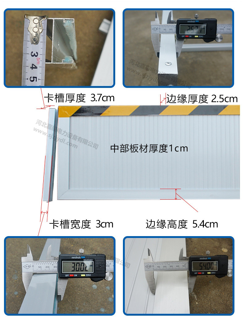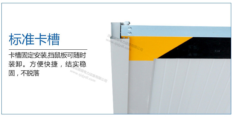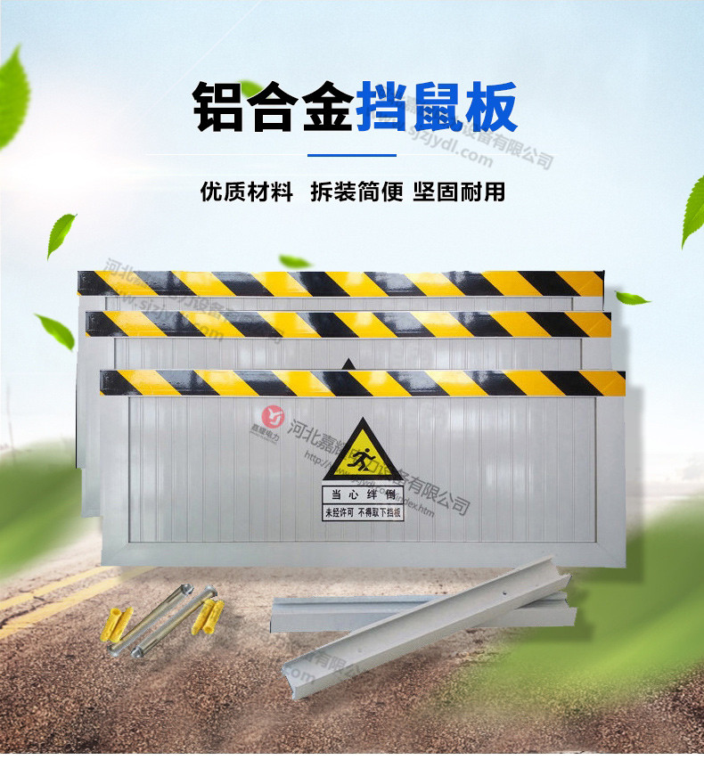 新型鋁合金材質擋鼠板替代老式擋鼠板材,實用、結實、耐用、使用時間長。由擋鼠板主板面和卡槽夠成,外觀可見部分為鋁合金定制,且貼有黃黑色的反光警示貼。