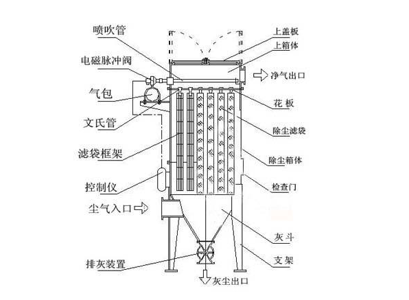 噴吹系統(tǒng):由控制儀、控制閥、脈沖閥、噴吹管、氣包和防護(hù)裝置組成。